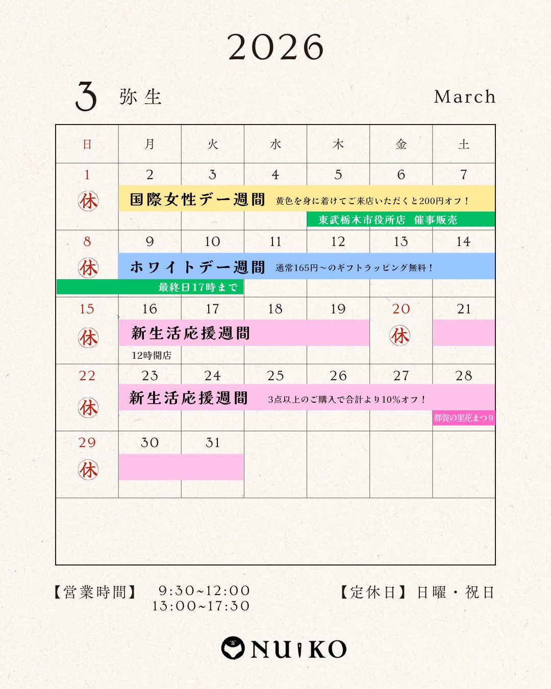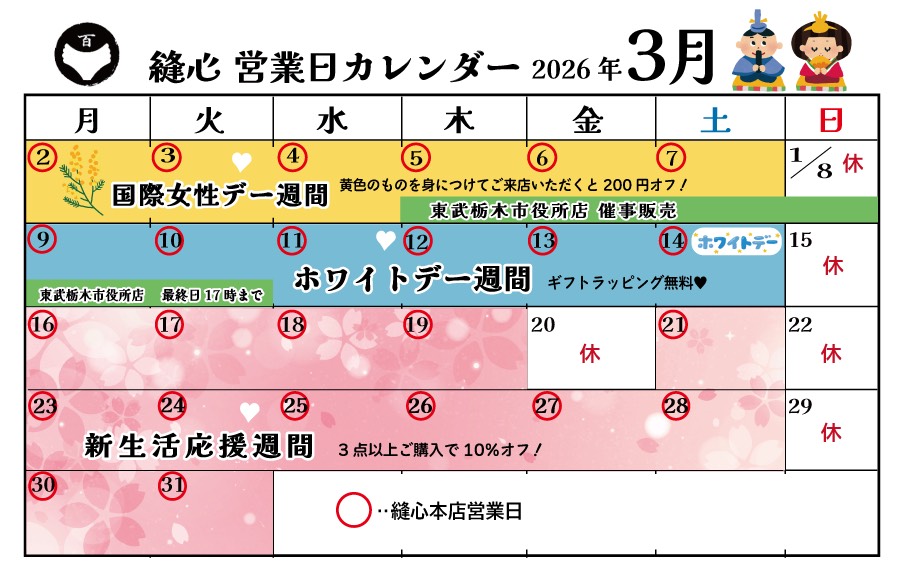 ☆縫心店舗の営業時間は9:30~17:30 土曜日も営業しております