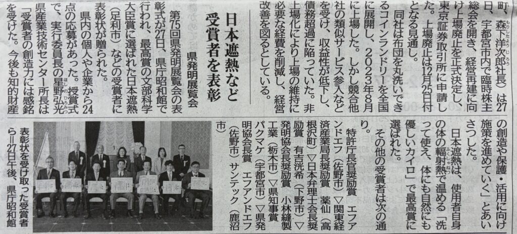 2025年11月29日 / 最終更新日時 : 2025年11月29日 小林 雄一 【メディア】陳列自販パネル「QRはいどーぞ」発明協会会長奨励賞授賞式 2025年11月27日栃木県庁昭和館にて執り行われた第75回栃木県発明展覧会 表彰式の記事が翌11/28に下野新聞に掲載されました。 FacebookXBlueskyCopy