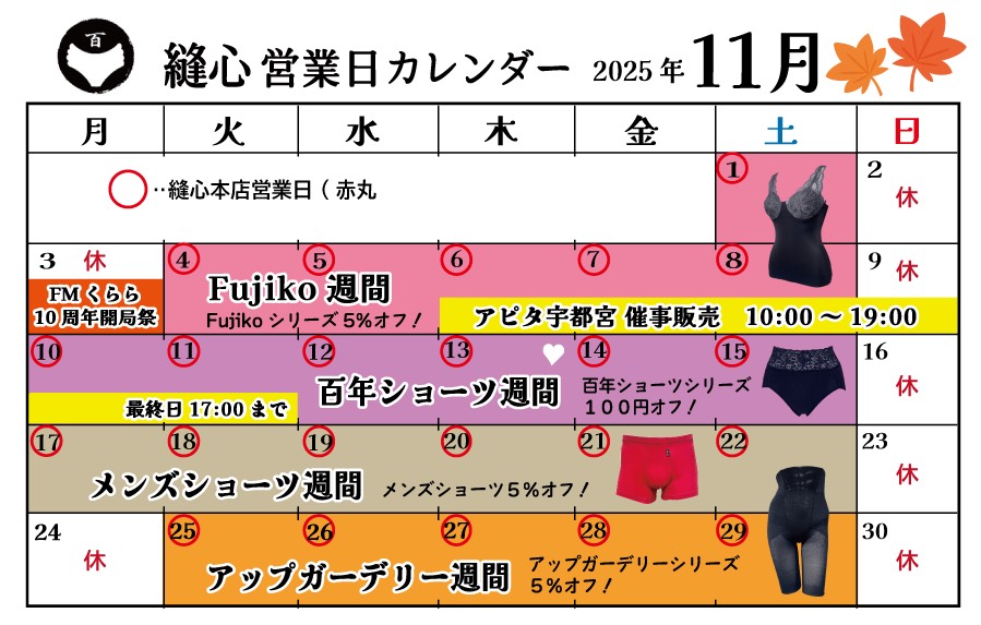 下着工場直売店 縫心 は土曜日も営業しております(カレンダーをご参照ください)
