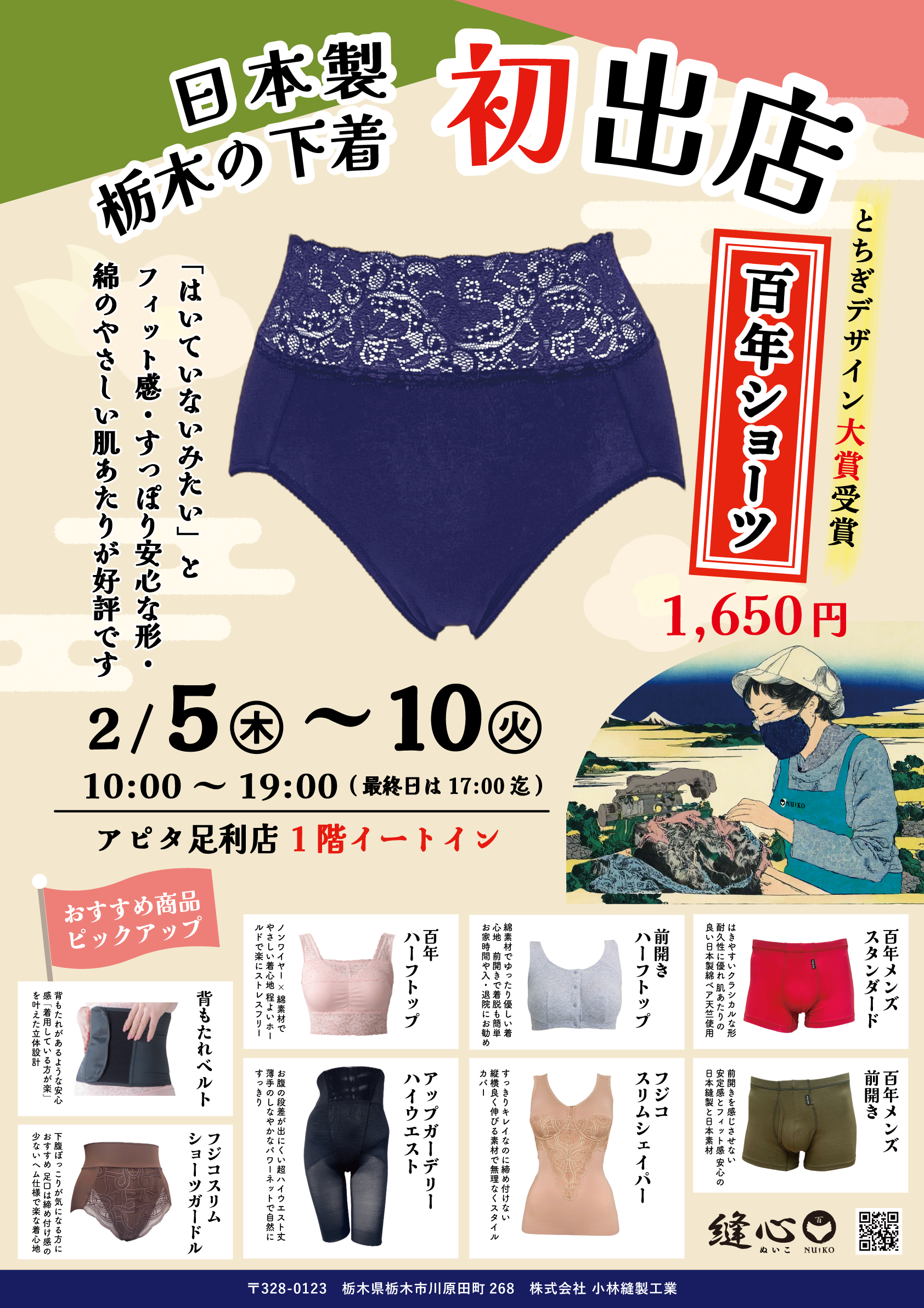 歴史と繊維の街、足利に栃木に工場で縫い上げた百年ショーツが初上陸です